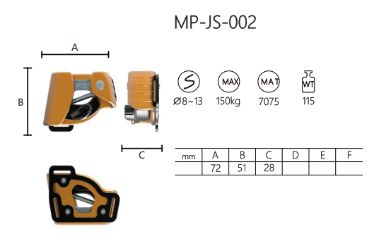 The MP-JS-002 is an industrial rope-gripping device made of 7075 aluminum alloy, designed for ropes with diameters of 8 - 13mm. It has a maximum load capacity of 150kg, ensuring reliable performance in various applications.