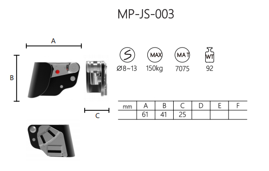 The MP-JS-003 is a robust rope-gripping device made of 7075 aluminum alloy, designed for ropes with diameters of 8 - 13mm. It has a maximum load capacity of 150kg, ensuring reliable performance in various applications.