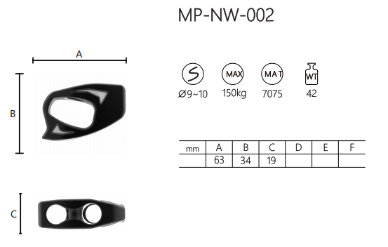 It measures 63mm in dimension A, 34mm in B, and 19mm in C. The device weighs 42g, offering a good balance of strength and lightness. Its black color and simple design make it easy to install and use. The MP-NW-002 is suitable for climbing and industrial rope access applications, providing a practical solution for ascending and managing ropes.