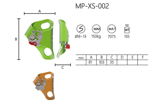 The MP-XS-002 Aluminum Alloy Ascender is a reliable tool designed for climbing and rope access tasks. It is compatible with ropes that are between 8mm and 13mm in diameter. Made from 7075 aluminum alloy, this ascender combines strength and longevity in a lightweight package, weighing just 135 grams. Its dimensions (81mm in length, 103mm in height, and 35mm in width) ensure a comfortable grip, making it easy to handle during operations.