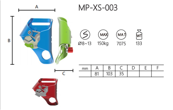 The MP-XS-003 7075 Aluminum Ascender is a versatile device for climbing applications. It is designed to work with ropes of diameter from 8 to 13 millimeters. Made of 7075 aluminum alloy, this ascender combines strength and durability. It has a weight of 133 grams and dimensions of 81mm in length (A), 103mm in height (B), and 35mm in width (C). The device provides a secure grip and efficient operation. With a maximum load capacity of 150 kilograms, it ensures safety during climbs. The MP-XS-003 offers smooth rope movement and reliable clamping. It is a practical solution for ascending ropes and can be easily integrated into various climbing systems. Proper use and regular inspection are important for maintaining its performance and safety.