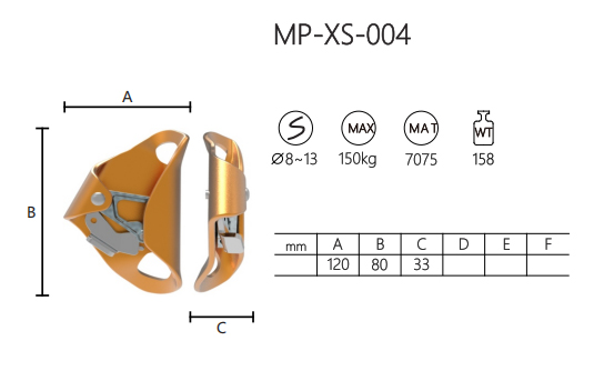 The MP-XS-004 Rope Fall Arrestor is a reliable device for climbing and rope access work. It’s designed to protect users on ropes of 8 –13 millimeters in diameter. Made of 7075 aluminum alloy, it is strong and durable. Weighing 158 grams, it is lightweight and easy to carry. Its dimensions are 120mm in length (A), 80mm in height (B), and 33mm in width (C), providing a comfortable grip and easy handling.