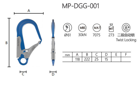 The MP-DGG-001 is a Twist Locking carabiner made of 7075 aluminum alloy with a surface treatment grade of 273. It has an MBS of 30kN and a diameter of 61mm, ensuring reliable strength and safety in demanding conditions.