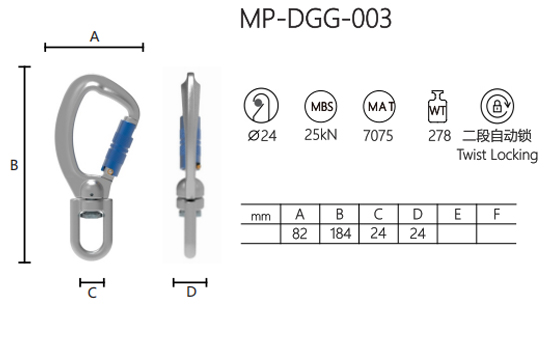 The MP-DGG-003 is a robust Twist Locking carabiner made of 7075 aluminum alloy. With a surface treatment grade of 278 and a diameter of 24mm, it offers an MBS of 25kN, ensuring reliable performance in demanding conditions.