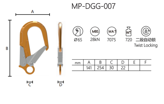 The MP-DGG-007 is a high-strength Twist Locking carabiner designed for demanding applications. Crafted from 7075 aluminum alloy with a surface treatment grade of 720, it ensures excellent durability and corrosion resistance. The carabiner features an MBS of 28kN and a diameter of 65mm, providing reliable strength and safety.