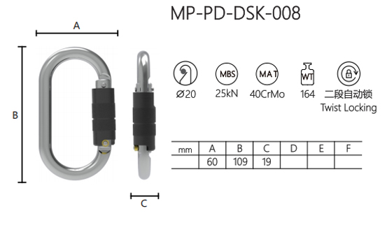 The MP-PD-DSK-008 is a Twist Locking carabiner made of 40CrMo alloy steel with a surface treatment grade of 164. It has an MBS of 25kN and a diameter of 20mm, ensuring reliable strength and safety in demanding conditions.
