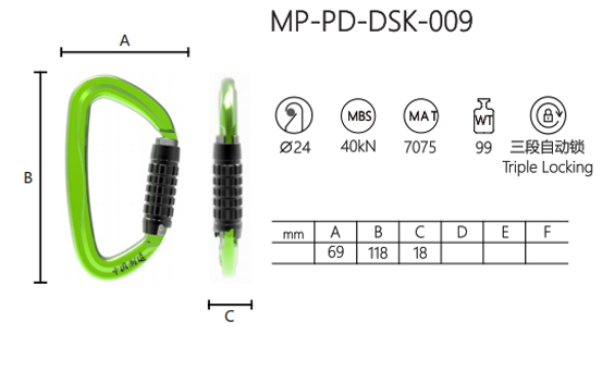 The MP-PD-DSK-009 is a high-strength Triple Locking carabiner made of 7075 aluminum alloy. It has a surface treatment grade of 99, a diameter of 24mm, and offers an MBS of 40kN, ensuring reliable performance in demanding conditions.