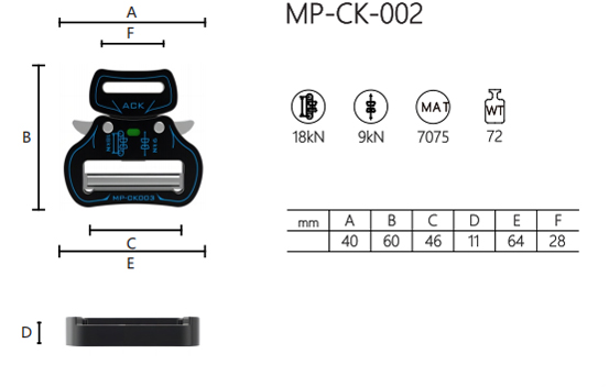 This high - strength quick - release buckle, MP - CK - 002, is made of 7075 aluminum alloy, a material known for its excellent strength - to - weight ratio and corrosion resistance. The buckle has dimensions of A 40mm, B 60mm, C 46mm, D 11mm, E 64mm, and F 28mm. It can bear loads of 18kN and 9kN, ensuring reliable performance in various applications. The WT72 marking suggests it can withstand a certain weight. With a sleek design and sturdy structure, it allows for quick and easy connection and release. It's suitable for outdoor gear, bags, etc., providing a safe and convenient fastening solution.