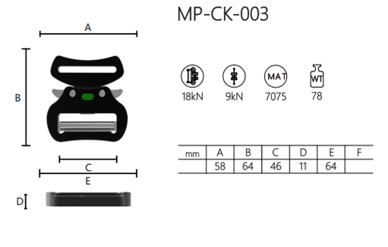 This high - strength quick - release buckle, MP - CK - 003, is made of 7075 aluminum alloy, a material known for its excellent strength - to - weight ratio and corrosion resistance. The buckle has dimensions of A 58mm, B 64mm, C 46mm, D 11mm, E 64mm, and F 6mm. It can bear loads of 18kN and 9kN, ensuring reliable performance in various applications. The WT78 marking suggests it can withstand a certain weight. With a sleek design and sturdy structure, it allows for quick and easy connection and release. It's suitable for outdoor gear, bags, etc., providing a safe and convenient fastening solution.