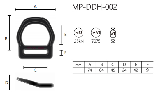 The MP-DDH-002 D-shaped ring is a robust connector made of 7075 aluminum alloy with a surface treatment grade of 62. It has an MBS of 25kN, ensuring reliable strength and safety in demanding conditions.