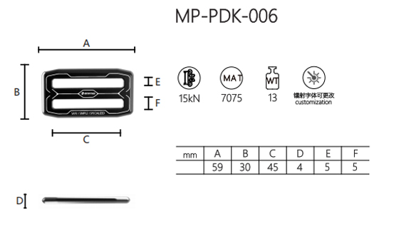 The MP-PDK-006 is a compact 7075 aluminum alloy belt buckle with a surface treatment grade of 13, supporting loads of 15kN for safety. Its dimensions are 59mm in length (A), 30mm in height (B), and 45mm in width (C), with a 4mm thickness (D) and slots of 5mm in width (E, F). Its low profile and robust build make it ideal for tactical belts. Users can customize it with laser-engraved text.