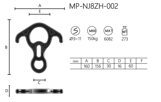 The MP-NJ8ZH-002 Figure-8 - 8 Descender is a premium tool for aerial descent and climbing. Crafted from durable 6082 aluminum alloy, it can bear a maximum load of 150kg. Designed for ropes with a diameter of 9 - 11mm, it ensures safe and smooth descents. Weighing 273g, it has dimensions of A:160mm, B:156mm, C:30mm, D:16mm, E:60mm, and F: not specified. It's unique triple-hole design allows for better rope control and stability during use. The ergonomic shape ensures comfortable handling. This device is ideal for various climbing activities like mountaineering and abseiling. Its compact size makes it easy to carry and store, perfect for outdoor enthusiasts.