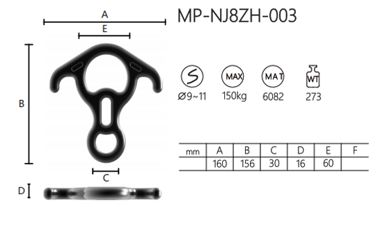 The MP-NJ8ZH-003 Figure-8 - 8 Descender is a high-performance device for controlling rope descent. Made of 6082 aluminum alloy, it offers a maximum load capacity of 150kg. It is designed for ropes with a diameter of 9 - 11mm. Weighing 273g, it has dimensions of A:160mm, B:156mm, C:30mm, D:16mm, E:60mm, and F: not specified. It's unique triple-hole design allows for better rope control and stability during use. The ergonomic shape ensures comfortable handling. This device is ideal for various climbing and rappelling activities. Its compact size makes it easy to carry and store, perfect for outdoor enthusiasts and professionals in aerial work or rescue operations.