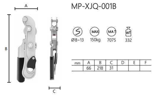 MP-XJQ-001B industrial rope grab is crafted from 7075 aluminum alloy, ensuring durability and strength. It can handle a max load of 150kg and is compatible with ropes of diameter 8~13mm. The dimensions are A66mm, B218mm, and C31mm, with a weight of 332g. Its compact and portable design makes it easy to carry. The rope grab offers a reliable grip and stable control during climbing or descending operations. It provides excellent handling and safety, making it a practical tool for industrial applications.
