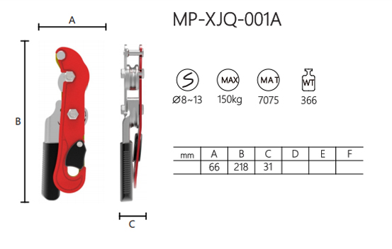MP-XJQ-001A rescue rope grab is made of 7075 aluminum alloy, offering good strength and durability. It has a max load of 150kg and works with ropes of diameter 8~13mm. The device measures A66mm, B218mm, and C31mm. Its compact design makes it easy to carry and use. With a robust and reliable structure, it provides effective gripping and control during rescue operations. The rope grab ensures safety and stability when climbing or descending, making it a practical tool for rescue scenarios.