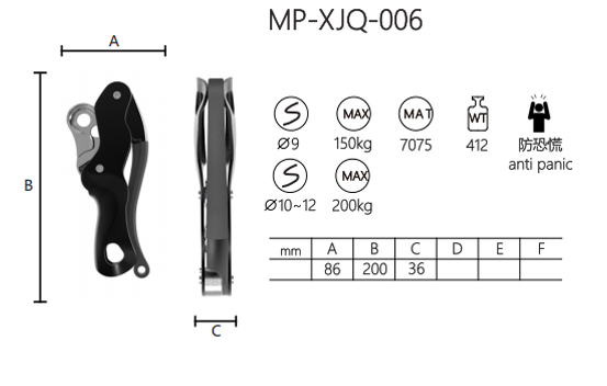 MP-XJQ-006 anti-panic descender is made of 7075 aluminum alloy. It has a max load of 150kg for 9mm rope and 200kg for 10~12mm rope. The device measures 86mm in A, 200mm in B, and 36mm in C, weighing 412g. Its anti-panic design ensures stable and reliable performance. The descender provides smooth and controllable descent, with adjustable mechanisms for different rope diameters. Its compact size and light weight make it easy to carry and use. The device offers effective control during descent operations, making it a practical tool for various scenarios.