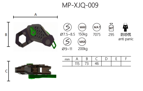 MP-XJQ-009 fall limiter is built with 7075 aluminum alloy. It supports two rope diameter ranges: 7.5~8.5mm with a max load of 150kg, and 9~11mm with a max load of 200kg. The device measures 115mm in A, 73mm in B, and 46mm in C, weighing 295g. Its anti-panic design ensures stable and safe operation. The fall limiter provides reliable performance and smooth control during use. Its compact size and light weight make it easy to carry. The device offers effective protection in fall scenarios, making it a practical tool for various applications.