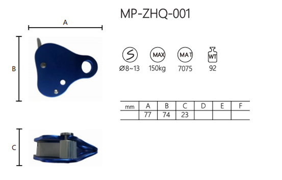 The MP-ZHQ-001 is a robust mechanical device designed to securely grip ropes with diameters of 8 - 13mm. Made of 7075 aluminum alloy, it has a maximum load capacity of 150kg, making it suitable for demanding applications.