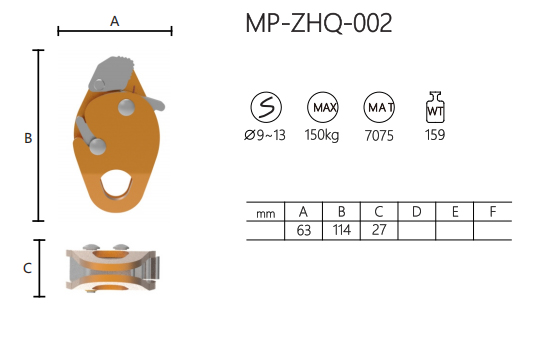 It measures 63mm in dimension A, 114mm in B, and 27mm in C. With a weight of 159g, it balances strength and lightness well. The device features a simple yet durable design, making it easy to install and use. Its orange and gray color scheme adds to its visibility and aesthetic appeal. The MP-ZHQ-002 is suitable for industrial applications such as rope systems and material handling, providing convenience in different scenarios.