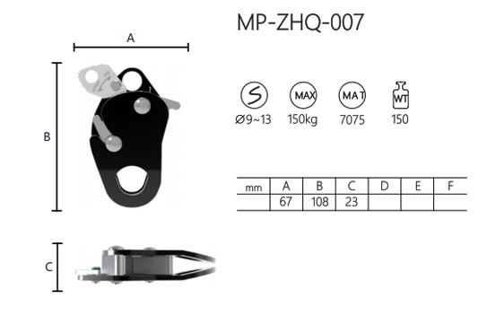 It measures 67mm in dimension A, 108mm in B, and 23mm in C. The device features a black and gray color scheme, with a compact and durable design. It weighs 150g, offering a good balance of strength and lightness. The MP-ZHQ-007 is easy to install and use, making it suitable for various industrial applications such as rope systems and material handling. Its structure allows for quick engagement and disengagement, providing convenience in different scenarios.