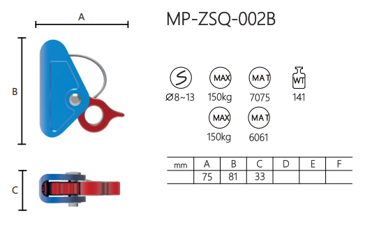 It measures 75mm in dimension A, 81mm in B, and 33mm in C. The device weighs 141g, offering a good balance of strength and lightness. It's blue and red color scheme enhances visibility. The MP-ZSQ-002B is easy to install and operate, making it suitable for outdoor climbing and rope access applications.