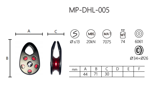 The MP-DHL-005 is a compact pulley designed for climbing applications. Made from 6061 aluminum alloy, it combines durability with lightweight construction at 74 grams. With a maximum breaking strength (MBS) of 20 kN, it supports ropes up to 13 mm in diameter.