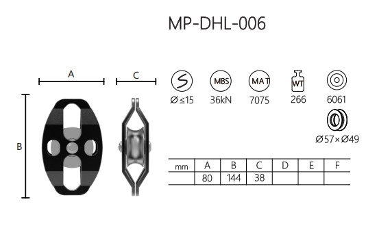 The MP-DHL-006 is a dual-hole pulley system designed for efficient load handling. Made from durable 6061 aluminum alloy, it offers reliability and lightweight construction. With a maximum breaking strength (MBS) of 36 kN, it accommodates ropes up to 15 mm in diameter. Weighing 266 grams, it balances durability with portability.