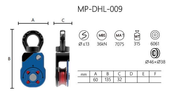 The MP-DHL-009 is a compact double pulley system designed for efficient load handling. Constructed from 6061 aluminum alloy, it offers durability while remaining lightweight at 315 grams. With a maximum breaking strength (MBS) of 36 kN, it accommodates ropes up to 13 mm in diameter.