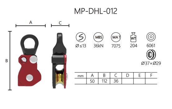 The MP-DHL-012 is a versatile single pulley designed for multi-directional applications. Constructed from durable materials, it features a compact design suitable for various rigging tasks. The pulley accommodates ropes up to 13 mm in diameter and has a maximum breaking strength (MBS) of 36 kN.
