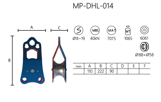 The MP-DHL-014 is an aluminum alloy climbing pulley. It has a length (A) of 110mm, total height (B) of 222mm, and a width (C) of 90mm. The pulley features a sheave with a diameter of 88mm and a width of 58mm. It is made of 7075 and 6061 aluminum alloys. The component has an MBS of 40kN and is suitable for rope diameters ranging from 8mm to 19mm. Weighing 1065g, it is designed for smooth operation and durability. The MP-DHL-014 is suitable for climbing applications where efficient load bearing and smooth movement are crucial.