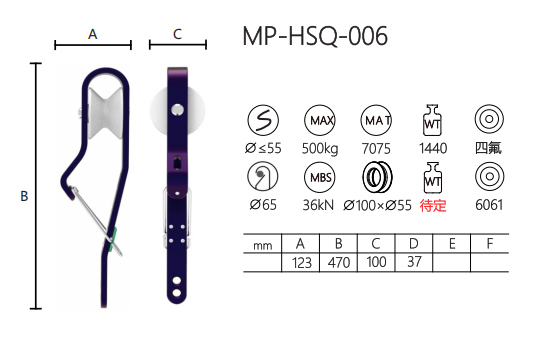 The MP-HSQ-006 is a purple cable car pulley system component. It has a length (A) of 123mm, total height (B) of 470mm, and a width (C) of 100mm. The pulley features a sheave with a diameter of 65mm and a width of 37mm. It is made of 7075 and 6061 aluminum alloys. The component has a maximum load capacity of 500kg and an MBS of 36kN. Weighing 1440g, it is designed for smooth operation with a tetrafluoroethylene coating. Additional specifications include a hole diameter of 55mm and dimensions of 100×55mm. The MP-HSQ-006 is suitable for cable car systems where efficient load bearing and smooth movement are crucial.