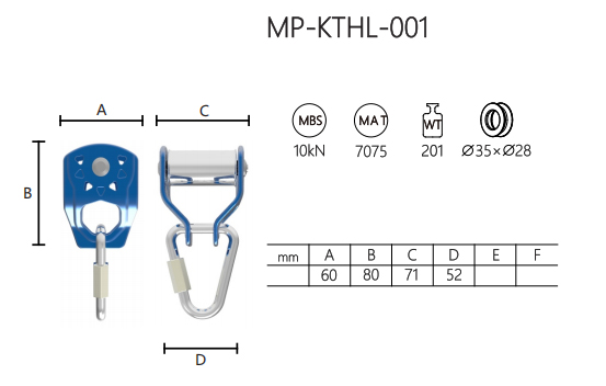 The MP-KTHL-001 is a blue outdoor pulley system component crafted from 7075 aluminum alloy, with a weight of 201g. It measures 60mm in length (A), 80mm in height (B), 71mm in thickness (C), and boasts a shaft hole diameter (D) of 52mm. The pulley is rated for a maximum breaking strength (MBS) of 10kN, ensuring reliable load-bearing capacity. It features a sheave with a diameter of 35mm and a width of 28mm, designed to minimize friction and enhance smooth operation.