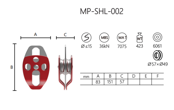 The MP-SHL-002 is a robust single pulley designed for efficient mechanical applications. Crafted from 6061 aluminum alloy, it offers reliable performance with a maximum breaking strength (MBS) of 36 kN. This pulley is suitable for ropes up to 15 mm in diameter and features a striking red and gray design.