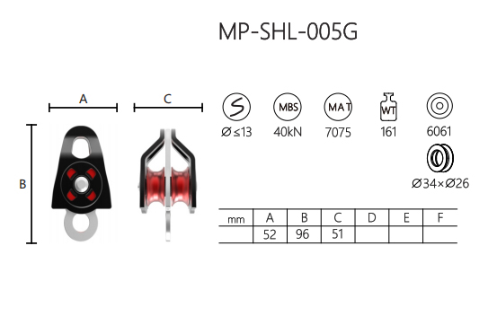 The MP-SHL-005G is a robust triple-wheel pulley designed for efficient load distribution. It has a compact size of 52mm in length (A), 96mm in height (B), and 51mm in width (C). The pulley features a sheave with dimensions of 34mm in diameter and 26mm in width. Made of 7075 and 6061 aluminum alloys, it offers a balance of strength and lightweight. The pulley has an MBS of 40kN and is suitable for ropes of diameter up to 13mm. Weighing 161g, the MP-SHL-005G is ideal for applications where smooth movement and reliable load bearing are essential.