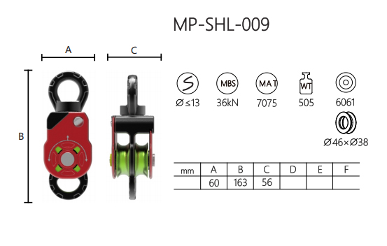 The MP-SHL-009 is a robust single-wheel pulley designed for reliable load bearing. It has a length (A) of 60mm, height (B) of 163mm, and a width (C) of 56mm. The pulley features a sheave with dimensions of 46mm in diameter and 38mm in width. Made of 7075 and 6061 aluminum alloys, it offers a balance of strength and lightweight. The pulley has an MBS of 36kN and is suitable for ropes of diameter up to 13mm. Weighing 505g, the MP-SHL-009 is ideal for applications where smooth movement and durable load bearing are essential.