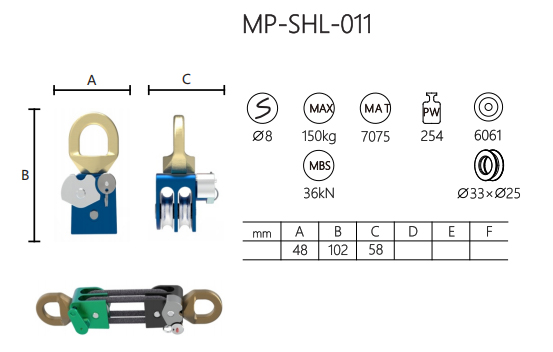 The MP-SHL-011 is a robust heavy duty pulley designed for demanding applications. It has a compact size with a length (A) of 48mm, height (B) of 102mm, and a width (C) of 58mm. Made from 7075 and 6061 aluminum alloys, it combines strength with durability. The pulley has an MBS of 36kN and a maximum load capacity of 150kg, making it suitable for lifting heavy loads. It features a sheave with dimensions of 33mm in diameter and 25mm in width. Additionally, it is designed to work efficiently with ropes of diameter 8mm, ensuring smooth operation and reliable performance.