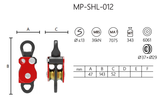 The MP-SHL-012 is a versatile double pulley designed for multi-directional use. It has a length (A) of 47mm, height (B) of 143mm, and a width (C) of 52mm. The pulley features a sheave with dimensions of 37mm in diameter and 29mm in width. Made of 7075 and 6061 aluminum alloys, it offers a balance of strength and lightweight. The pulley has an MBS of 36kN and is suitable for ropes of diameter up to 13mm. Weighing 343g, the MP-SHL-012 is ideal for applications where reliable load bearing and smooth movement are essential.