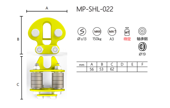 The MP-SHL-022 is a robust triple-roller pulley designed for efficient load distribution. It has a compact size of 56mm in length (A), 53mm in width (B), and 62mm in height (C). Made of A3 steel and bearing steel, it offers durability and strength. The pulley has a maximum load capacity of 150kg and is designed for ropes of diameter 13mm. It features bearings with a diameter of 19mm. The MP-SHL-022 is ideal for applications requiring smooth movement and reliable load bearing.