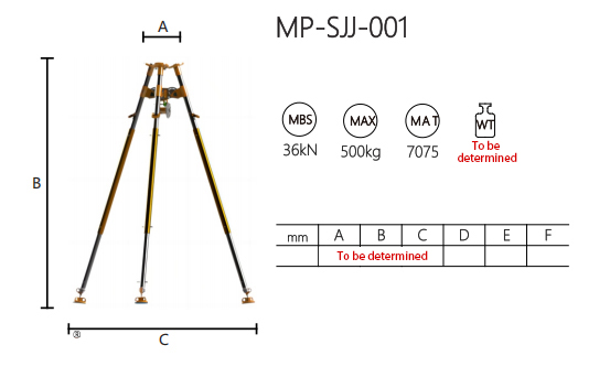 MP-SJJ-001 is a tripod constructed from 7075 aluminum alloy. With a max load of 500kg and an MBS of 36kN, it ensures strong and durable support. The tripod is designed for stability and balance, making it suitable for various applications requiring reliable positioning and support. Its adjustable legs allow for flexible setup on different terrains, providing a solid base for equipment. The tripod offers a practical solution for tasks that demand stability and strength.