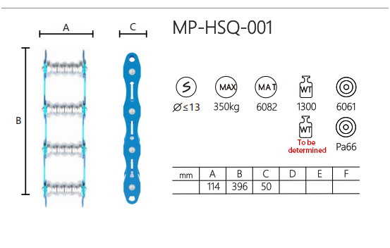 MP-HSQ-001 is a climbing ladder connector made of 6061 aluminum alloy and Pa66 material. It has a max load capacity of 350kg and is designed for ropes with a diameter of up to 13mm. The connector measures A114mm, B396mm, and C50mm, with a weight of 1300g. Its sturdy construction ensures reliable and stable connections. The durable materials provide good strength and corrosion resistance. The connector offers a practical solution for linking climbing ladders and other equipment, ensuring secure and stable support during use. Its design allows for easy installation and removal, making it convenient for various climbing applications.