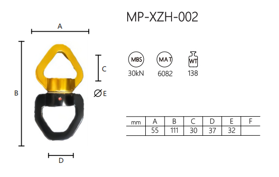 MP-XZH-002 is a swivel link crafted from 6082 aluminum alloy. It features an MBS of 30kN and a max load of 300kg. The dimensions are A55mm, B111mm, C30mm, D37mm, and E32mm, with a weight of 138g. Its compact and lightweight design ensures portability and ease of use. The swivel link provides smooth rotational functionality, ensuring reliable connections and stable performance. Its durable construction makes it suitable for various applications requiring secure linking and movement.