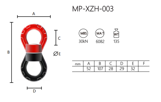 MP-XZH-003 is a swivel link made of 6082 aluminum alloy. It has an MBS of 30kN and a max load of 300kg. The link measures A52mm, B107mm, C28mm, D29mm, and E32mm, with a weight of 135g. Its compact size and light weight make it easy to carry and handle. The swivel link provides smooth operation and reliable connections, ensuring stable performance during use. Its durable construction allows for long-lasting use in various applications.