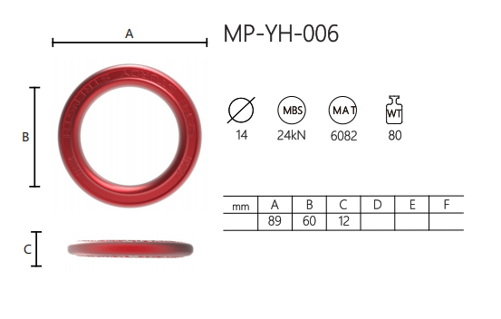 The MP-YH-006 is a red steel circular ring with specific dimensions and markings. Its outer diameter (A) measures 89mm, inner diameter (B) is 60mm, and the thickness (C) is 12mm. The ring bears several inscriptions: MP-YH-006 at the top, and four symbols with corresponding values—MBS 24kN, MAT 6082, and WT 80. Additionally, there's a crossed-out circle with the number 14 inside it. These markings likely indicate material specifications, strength ratings, and other technical details relevant to its application.