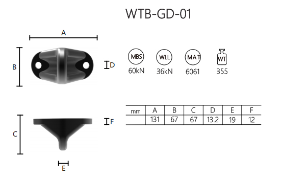 The WTB-GD-01 is an aluminum force distribution plate with specific dimensions and markings. Its length (A) measures 131mm, height (B) spans 67mm, and thickness (C) is 19mm. The plate features a diameter (D) of 13.2mm, width (E) of 19mm, and additional measurement (F) of 12mm. The component includes inscriptions: WTB-GD-01 at the top, along with symbols and values indicating MBS 60kN, WLL 36kN, MAT 6061, and WT 355.